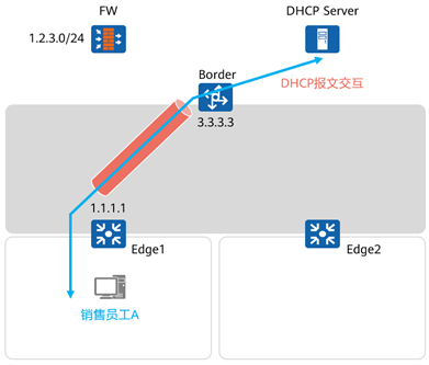 - 销售员工A接入网络,首先完成用户认证,认证成功后,认证点Edge1获得该用户的授权结果,将用户划分到对应VLAN。