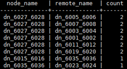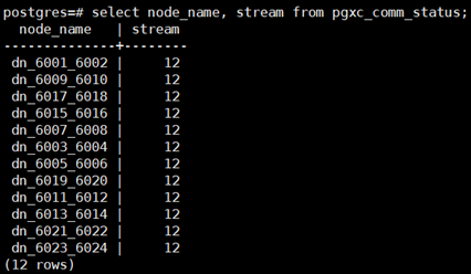 - 在CN上查询当前任意两个DN之间的stream情况:select node_name, remote_name, count(*) as stream from pgxc_comm_send_stream group by 1, 2 order by 3 desc limit 30;