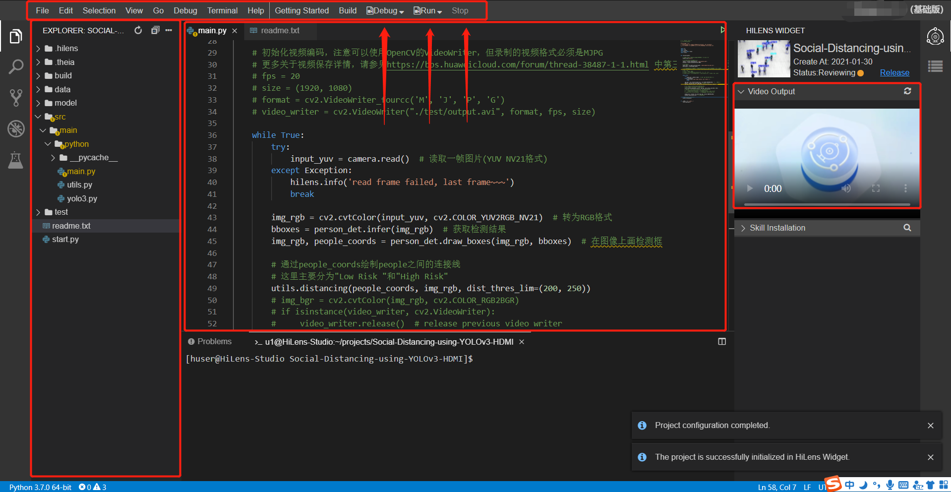整体基于ModelArts和HiLens Stuio 1.5.0开发,参考开源代码实现,很惭愧的是大部分内容都是人家的,自主创新性很少。不过整体开发还是很顺利的,从得到模型到在HiLens Studio调试完成来说,不到一个下午就能搞定了,这是极致效率的体现,这得益于在线IDE HiLens Studio的使用,作为一款线上IDE,提供了开发,调试的完整功能,甚至可以在线运行调试,直接得到程序运行的可视化结果展示。同时提供了丰富的模板,基于模板开发,大大提高开发效率。