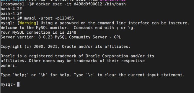 3、用容器id进入MySQL容器,执行mysql命令登录MySQL