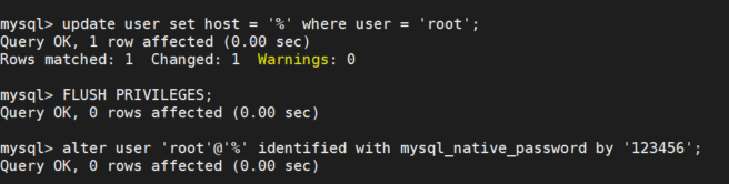 alter user 'root'@'%' identified with mysql_native_password by '123456';