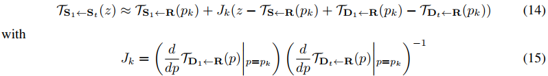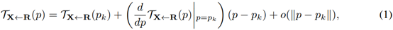 假设TX<-R满足在关键点的领域是双射双射,也就是有TR<-X =TX<-R-1。这样在关键点pk附近有