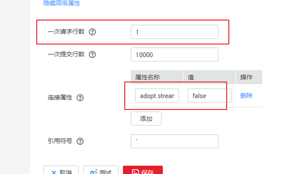新建Mysql连接器,建立方法详见官网,在高级属性中增加useCursorFetch=false和adopt.stream=false