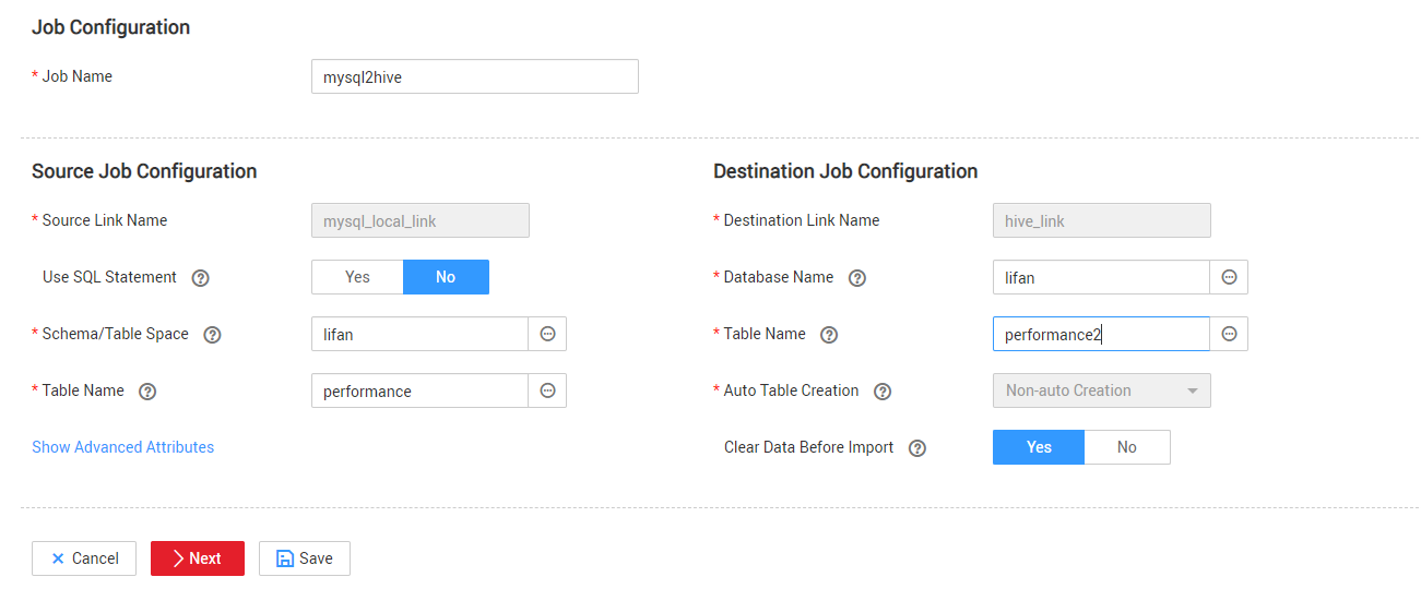 新建Mysql2Hive的CDM迁移作业,源表101个字段,100万行数据,配置如下