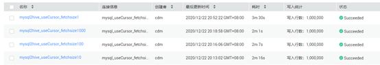方式2:同样写入100万行,调整fetchSzie分别为1,10,100,100,最低耗时2m1s