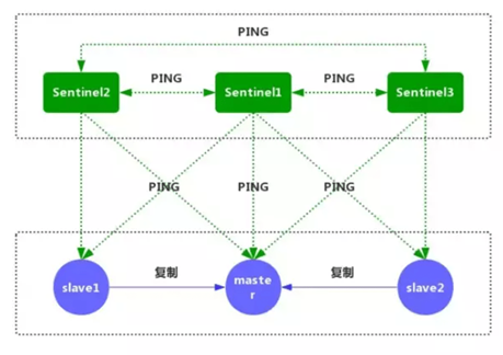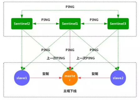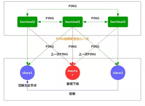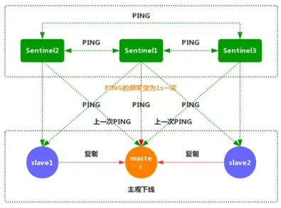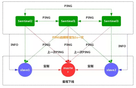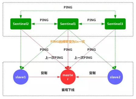 1、每个Sentinel节点都需要定期执行以下任务:每个Sentinel以每秒一次的频率,向它所知的主服务器、从服务器以及其他的Sentinel实例发送一个PING命令。(如上图)