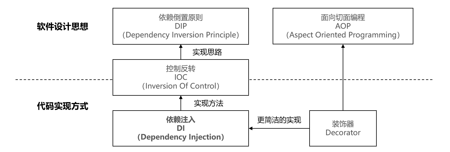 依赖注入(Dependency Injection,简称DI)并不算一个复杂的概念,但想要真正理解它背后的原理却不是一件容易的事情,它的上游有更加抽象的IOC设计思想,下游有更加具体的AOP编程思想和装饰器语法,只有搞清楚整个知识脉络中各个术语之间的联系,才能够建立相对完整的认知,从而在适合的场景使用它,核心概念的关系如下图所示: