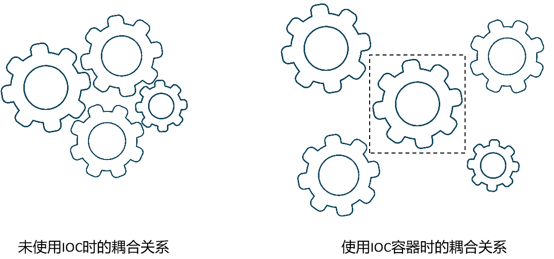 IOC容器的使用对于模块之间耦合关系的影响是非常明显的,在原来的手动实例化模型中,模块之间的关系时相互耦合的,模块的变动很容易直接导致依赖它的模块发生修改,因为上层模块对底层模块本身产生了依赖;在引入IOC容器后,每个类只需要调用容器的注册方法将自己的信息登记进去,其他模块如果对它有依赖,通过调用IOC容器提供的方法就可以获取到所需要的实例,这样一来,子模块实例化的过程和主模块之间就不再是强依赖关系,子模块发生变化时也不需要再去修改主模块,这样的处理模式对于保障大型应用的稳定性非常有帮助。现在我们再回过头看看那张经典的控制反转示意图,就比较容易理解其背后完成的工作了: