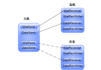 保证主备实例数据强一致性依赖数据同步机制,主要分为日志同步与数据页同步,如图2所示,WalSend与DataSend在主机实例上运行分别负责发送日志文件与数据页发送至备机或从备(在备机故障情况下发送至从备),WalReceiver与DataReceiver,在备机或从备实例运行负责接收后并有对应线程将其落盘达到数据强一致。