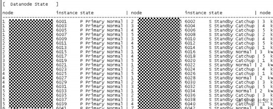 | 1 10-x-179-67 6001 /srv/BigData/mppdb/data1/master1 P Primary Normal | 2 10-x-179-95 6002 /srv/BigData/mppdb/data1/slave1 S Standby Catchup| 3 ASG003 3002 /srv/BigData/mppdb/data1/dummyslave1 R Secondary Normal 2 10-x-179-95 6007 /srv/BigData/mppdb/data2/master2 P Primary Normal | 1 10-x-179-67 6008 /srv/BigData/mppdb/data1/slave2 S Standby Catchup | 3 ASG003 3005 /srv/BigData/mppdb/data2/dummyslave2 R Secondary Normal |