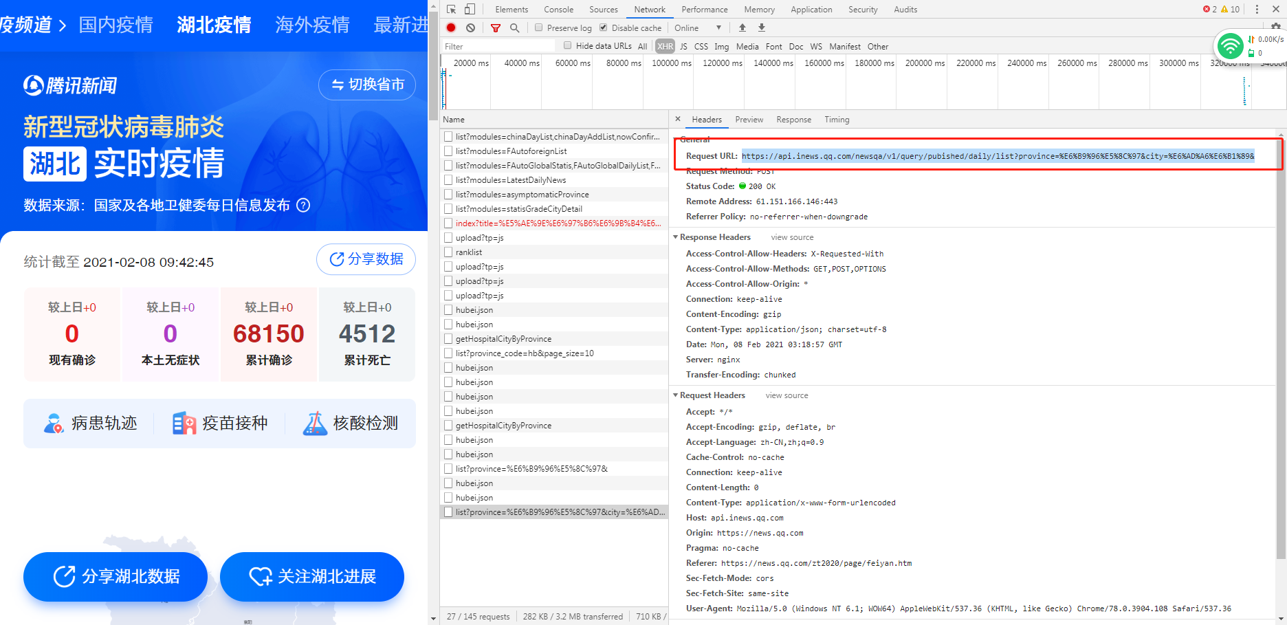 http 请求为 POST 请求,参数为 province ,对应的 url 为 https://api.inews.qq.com/newsqa/v1/query/pubished/daily/list?province=%E6%B9%96%E5%8C%97&city=%E6%AD%A6%E6%B1%89&