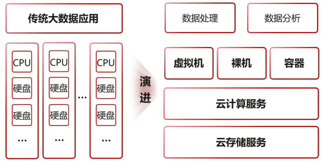 传统大数据平台的群部署,依赖 “硬件->操作系统->组网->大数据平台”的部署模式,部署周期以周粒度计算,并涉及多个业务部门协同操作。针对扩容、业务迁移和后期运维,也是“一集群一方案”的操作模式,工作量大,物料和人工成本都偏高。