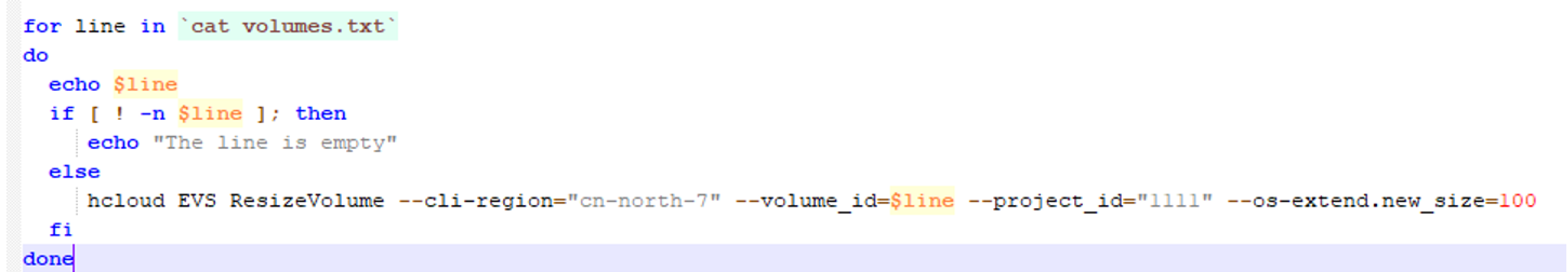 小Hi拍手叫好,立马找到小V,小Hi立马跟她说了办法:“小V,你把你那些硬盘的id从excel里面复制出来,保存到一个txt文件,然后你下载一个华为云CLI的客户端,写一个你熟的不能再熟的批处理脚本,从txt里面取出硬盘id,循环调用这个APIExplorer生成的命令行,就可以实现批量扩容了,而且下次一改值还可以扩,爽歪歪”。小V眨了眨水灵灵的大眼睛,两眼放光说“真有你的,小Hi,你怎么知道还有华为云CLI这么好的工具呢,写脚本我在行,我来搞定就行,看来马上就可以下班了”。小V三下五除二搞定了脚本resize.sh