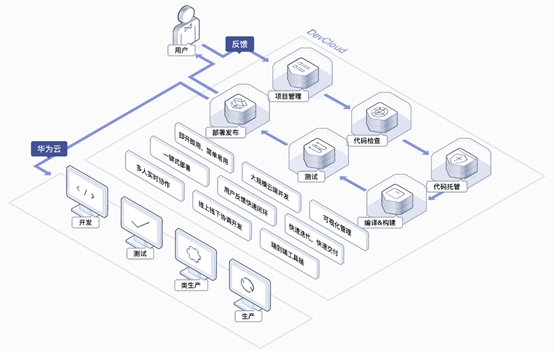 华为云软件开发平台(DevCloud)是一站式云端DevOps平台,面向开发者提供的云服务,即开即用,随时随地在云端进行项目管理、代码托管、代码检查、流水线、编译、构建、部署、测试、发布等,让开发者快速而又轻松地开启云端开发之旅。