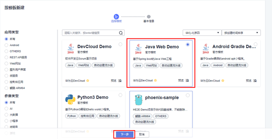 选择名为“Java Web Demo”的官方代码仓库模板,点击“下一步”。