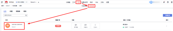 点击项目“demo”项目顶部菜单栏“代码”,然后选择“代码检查”进入代码检查界面,选择“web-dev-codecheck”检查任务,进入