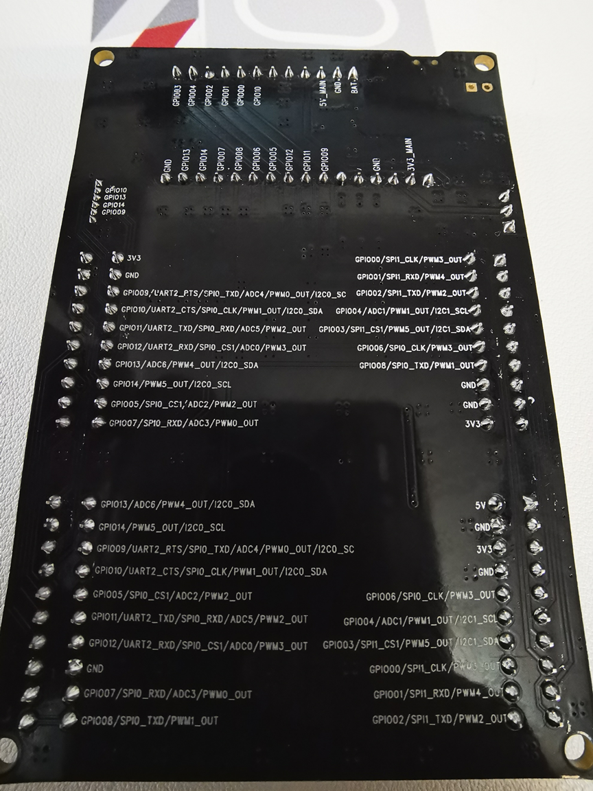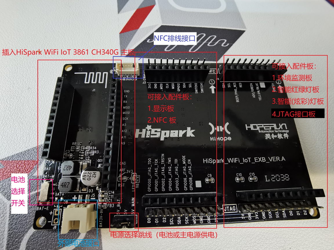 一块HiSpark WiFi IoT物联网底板2-1,做工不错,特别是地板背面细心地印上了端口作用如图2-2所示: