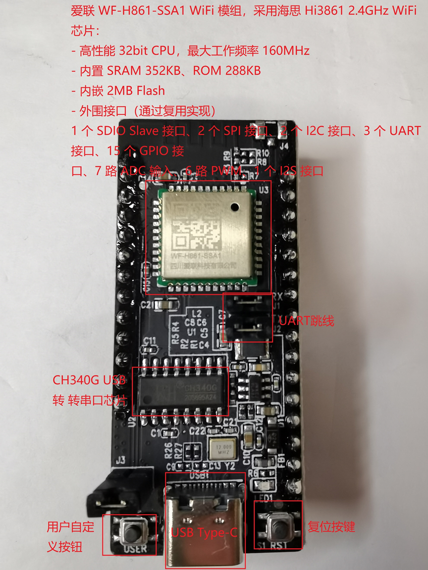 一块HiSpark WiFi_IoT 3861 CH340G主板,采用海思Hi3861CPU方案外形及部分注释如图3-1所示: