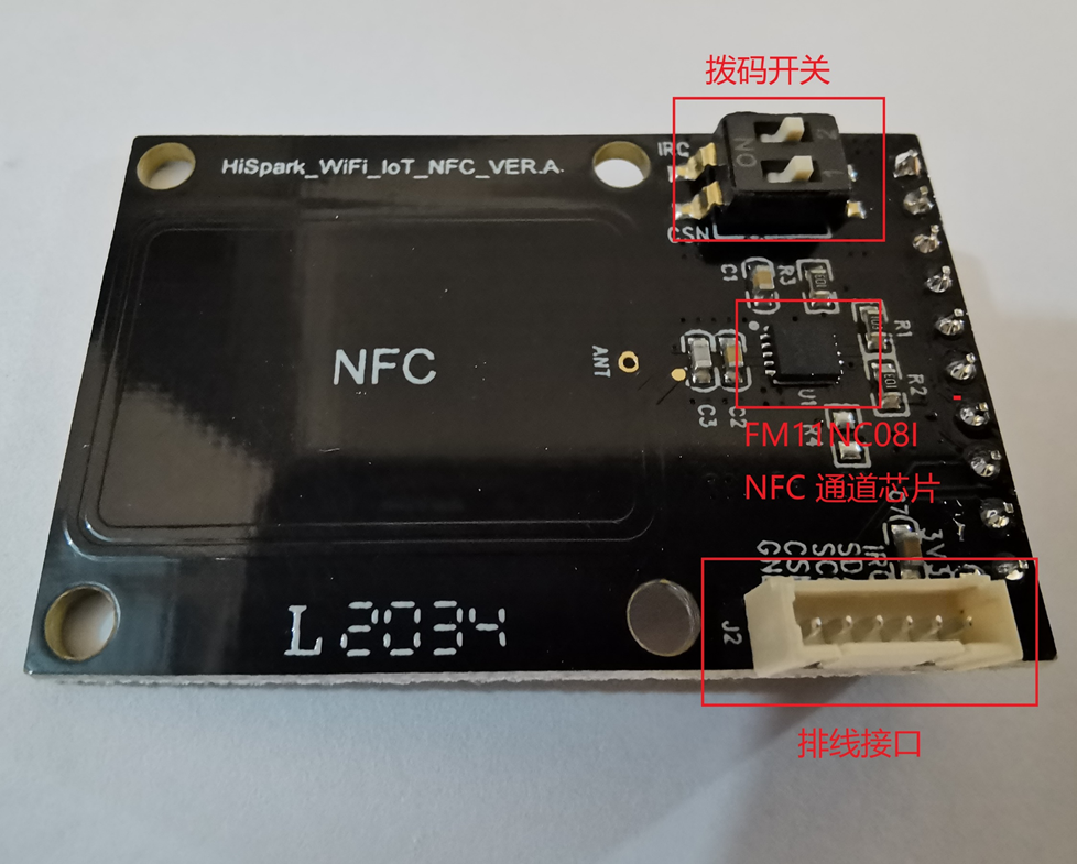 一块HiSpark_WiFi_IoT_NFC板,芯片型号:FM11NC08I NFC,工作频率:13.56MHz,内置 8k bit EEPROM(用户区 7200 bit)如下图5-1: