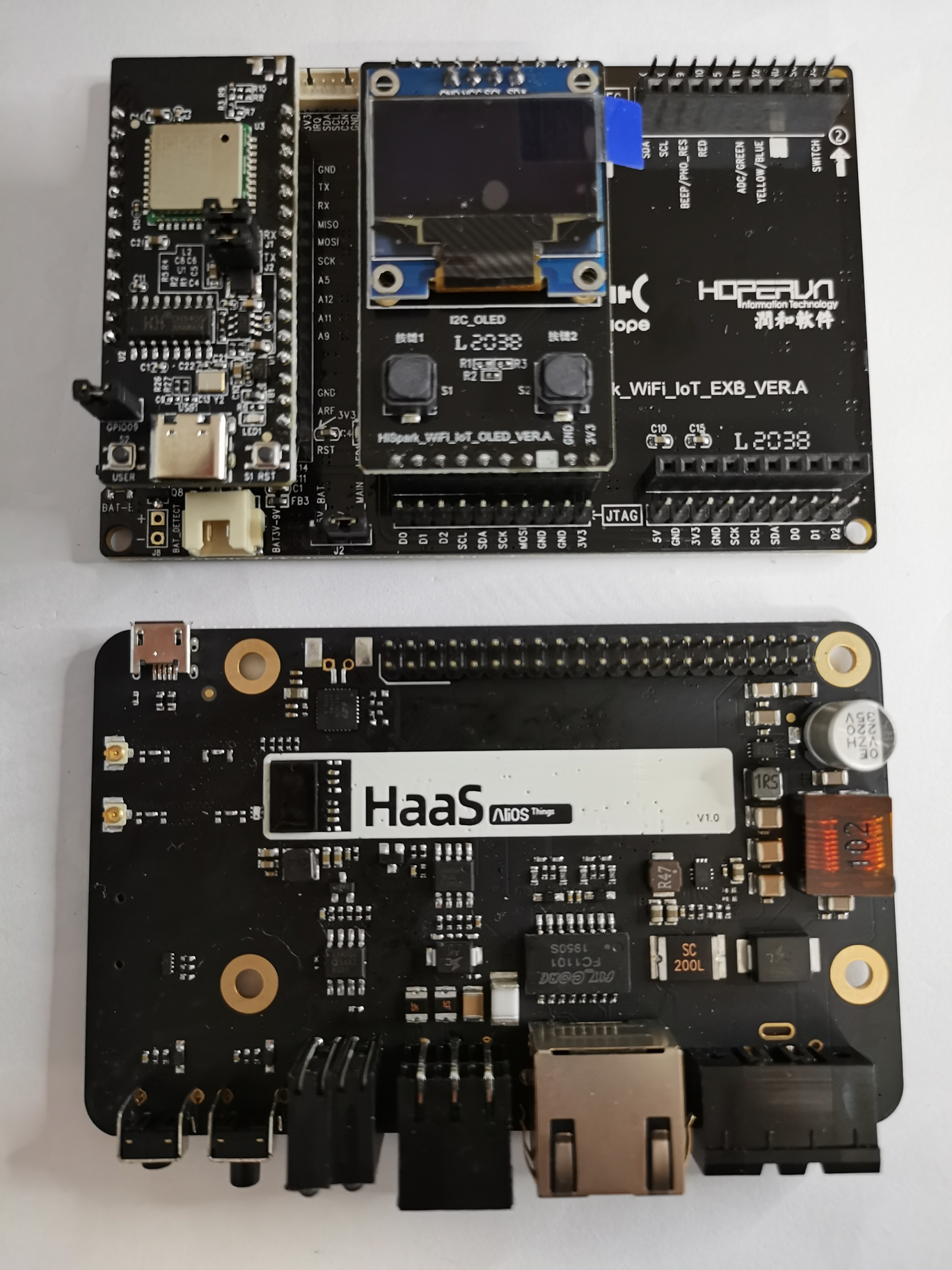 HiSpark WiFi IoT物联网板(安装部分功能板形态)与阿里云HaaS100(图12-5),HaaS600(图12-6)对比: