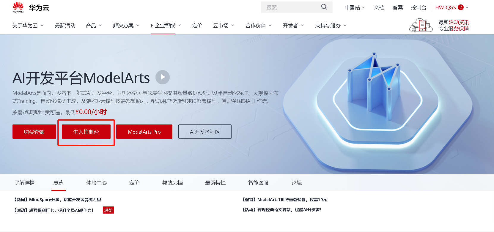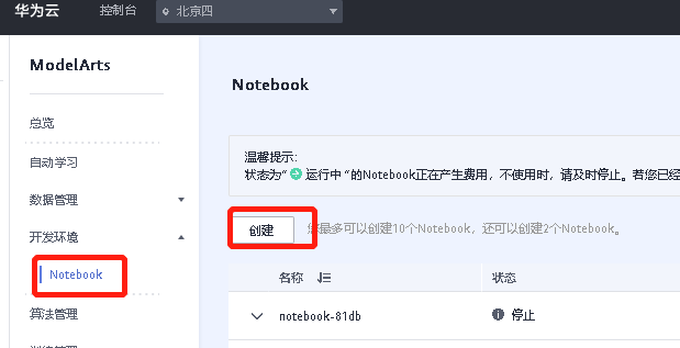 登陆ModelArts控制台https://www.huaweicloud.cn/product/modelarts.html -> 开发环境 -> Notebook -> 创建