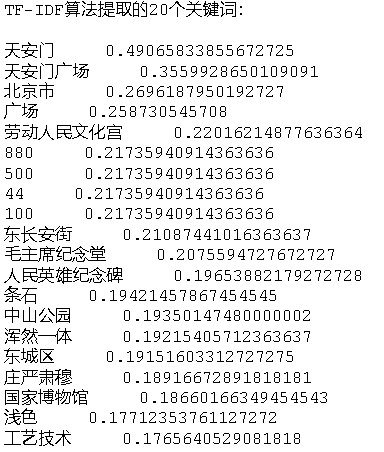print("TF-IDF算法提取的20个关键词:\n")