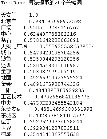 print("TextRank 算法提取的20个关键词:\n")