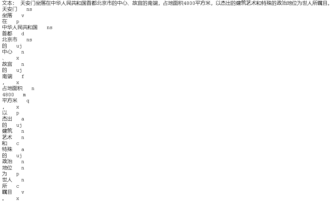pseg_text = "天安门坐落在中华人民共和国首都北京市的中心、故宫的南端,占地面积4800平方米,以杰出的建筑艺术和特殊的政治地位为世人所瞩目。"