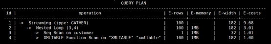 在GaussDB(DWS)上,XMLTABLE函数支持下推到数据节点DN执行的STREAM查询计划,XML数据在数据节点上进行解析生成XMLTABLE结果表,通过GATHER STREAM将结果汇总到协调节点CN上,能够下推到DN的STREAM计划具有较好的查询性能。