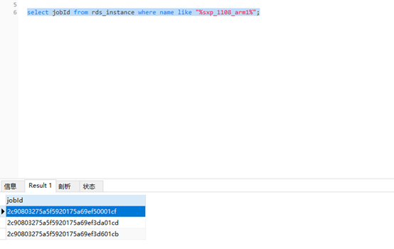 登录rms数据库,执行select jobId from rds_instance where name like "%{clusterName}%";其中{clusterName}为集群名称,从rds_instance表中根据集群名查找jobId字段