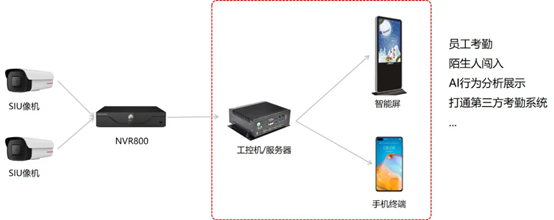 针对办公解决方案,峰杰基于华为好望摄像机和NVR的智能能力,通过自己的工控机调用NVR800的API接口,实时传送考勤数据到大屏和APP,快速实现人员考勤,同时也可以实现周界入侵、目标识别等功能。