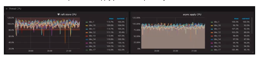 raftstore.store-pool-size)为 2,所有的写请求都会先在 Raftstore 线程 fsync 的方式写入 RocksDB(除非手动将raftstore.sync-log设置为 false;而raftstore.sync-log设置为 false,可以提升一部分写性能,但也会增加在机器故障时数据丢失的风险)。由于存在 I/O,Raftstore 线程理论上不可能达到 100% 的 CPU。为了尽可能地减少写磁盘次数,将多个写请求攒在一起写入 RocksDB,最好控制其整体 CPU 使用在 60% 以下(按照线程数默认值 2,则 Grafana 监控上的 TiKV-Details.Thread CPU.Raft store CPU 上的数值控制在 120% 以内较为合理)。不要为了提升写性能盲目增大 Raftstore 线程池大小,这样可能会适得其反,增加了磁盘负担让性能变差。