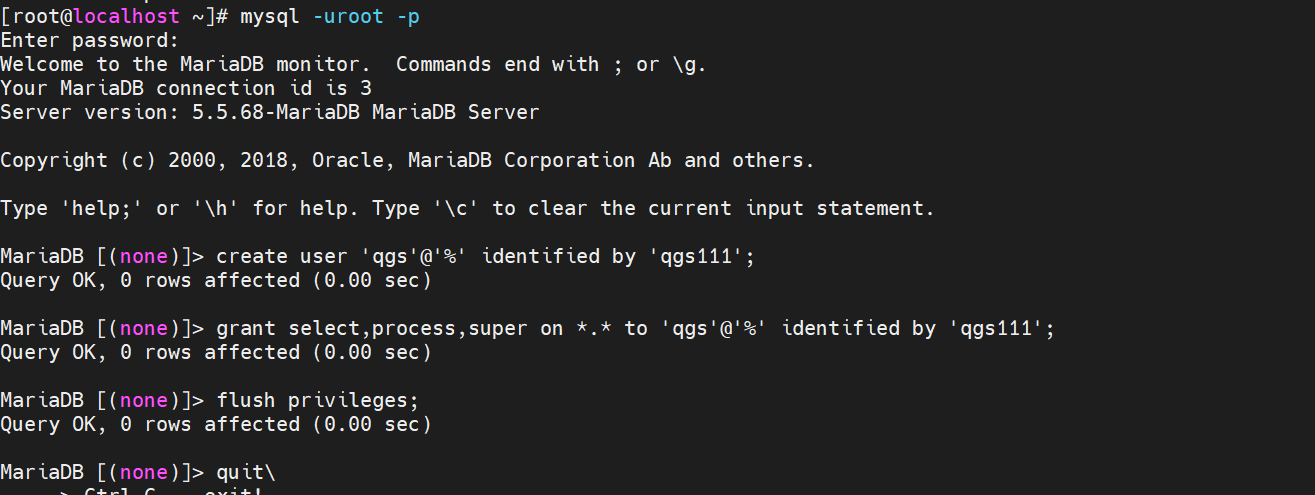 grant select,process,super on *.* to 'qgs'@'%' identified by 'qgs111'; #grant select,process,super on *.* to '用户名'@'%' identified by '密码'; 允许所有ip连接(用通配符%表示),只允许指定IP地址链接将%去掉即可