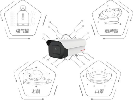 华为机器视觉的软件定义摄像机、智能视频存储产品和安徽水天科技公司以厨房场景为核心的智能分析能力(厨师帽识别、口罩识别等)相结合,解决目前学校、园区、机关单位的后厨的安全及卫生问题,发现异常通过水天科技智能化综合管理平台自动告警提示并推送到指定平台,帮助经营者实现:
