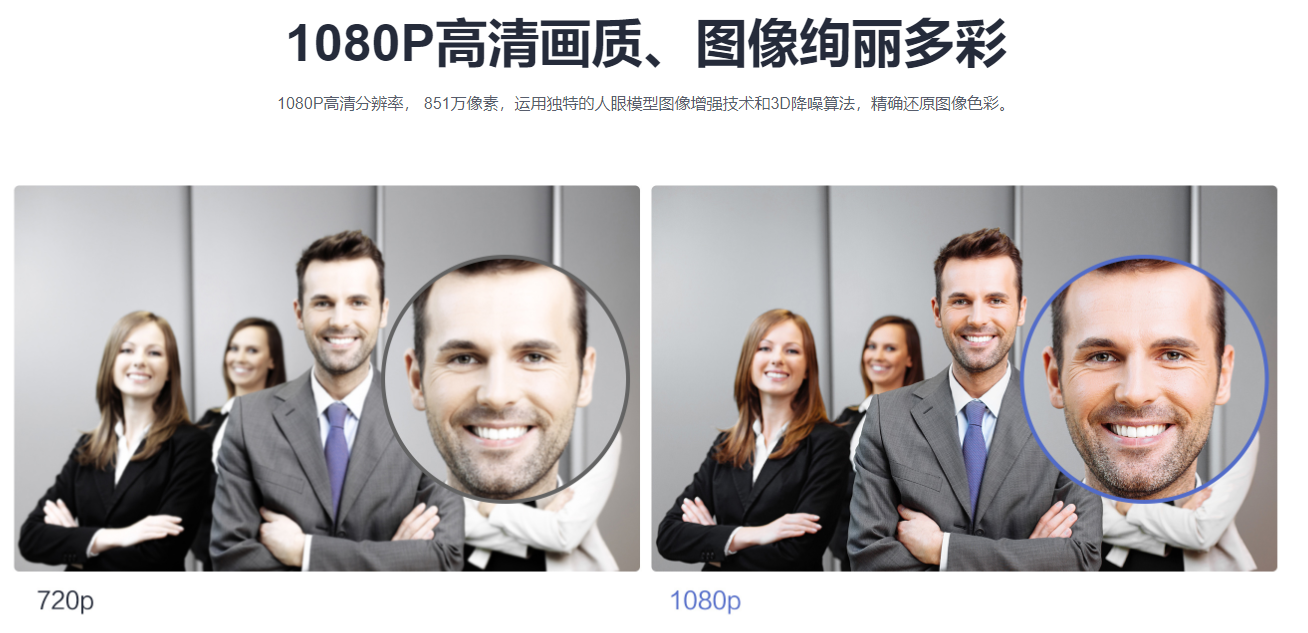 采用851万像素CMOS图像传感器,提供HDMI接口,最高支持1080p60帧视频输出。基于独特的人眼模型图像增强技术和基于运动估计的3D降噪算法,精确还原图像色彩,使画面层次感强、细节丰富,为视频会议提供专业、真实的高清图像效果。同时提供独有的标准、自然、鲜艳,风景4种灵活的图像设定模式,满足不同客户图像色彩需求,达到前所未有的视觉体验。