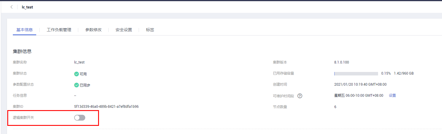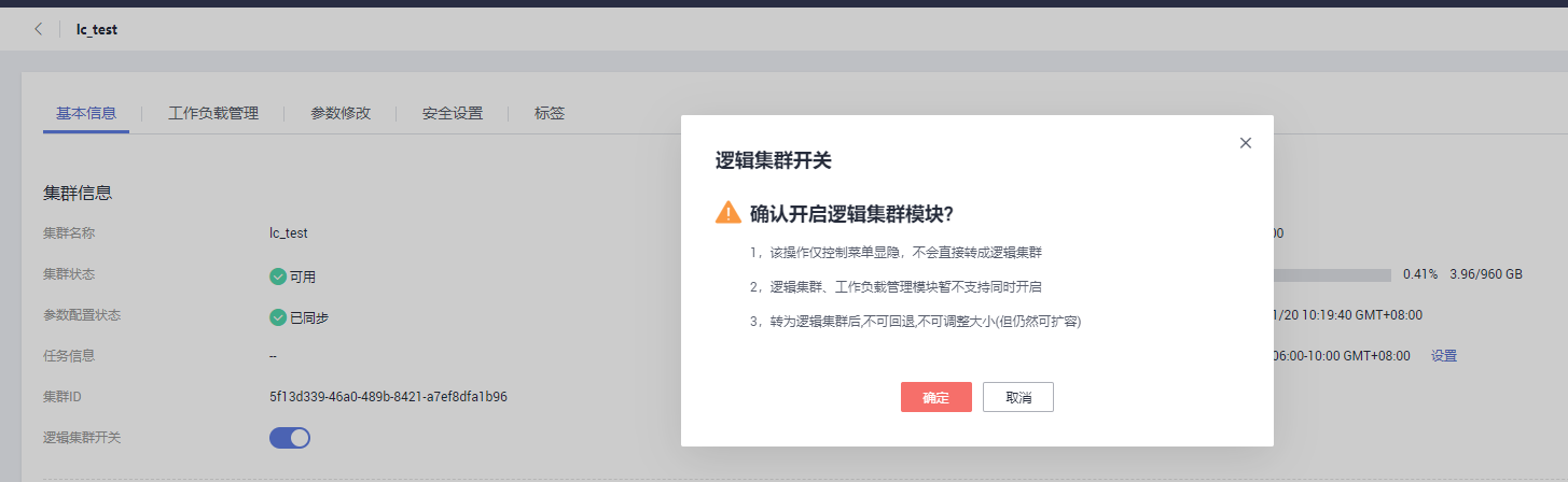 如果是首次使用逻辑集群管理功能,需要先进入集群详情页面打开逻辑集群开关,打开开关后会出现“逻辑集群管理”的页签,此时点击页签进入逻辑集群管理页面会进行逻辑集群初始化操作,该操作会同步后台创建的逻辑集群至前台页面,但是初始化操作只会在首次进入逻辑集群管理页面时执行一次,目的是为了兼容历史版本客户在后台手动创建的逻辑集群。如:客户很早之前创建了一套8.1.0的DWS集群,并在后台使用命令创建了逻辑集群,那么当该集群升级到8.1.0.100版本之后,初始化操作会将后台创建的逻辑集群信息更新到页面。注意初始化操作只会做一次,后续必须在管控面逻辑集群管理页面做逻辑集群的管理操作,不再支持从后台创建。