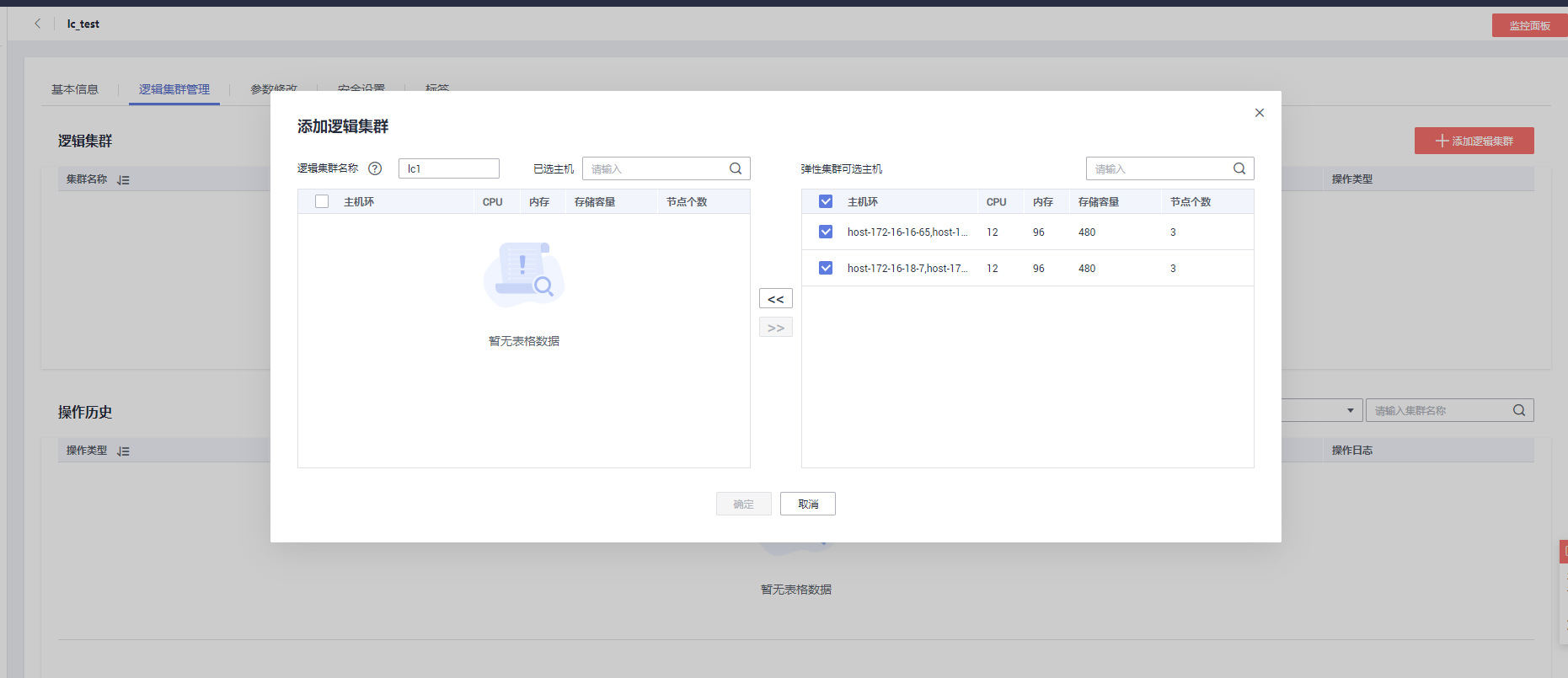 当某个逻辑集群容量不足时,可以为该逻辑集群扩容,如果弹性集群中有充足节点,可以优先从弹性集群中添加节点至逻辑集群,点击编辑按钮,将主机环从弹性集群中移至逻辑集群,然后点击确定提交添加节点任务,节点添加至逻辑集群之后会自动执行重分布,待重分布完成之后即可使用扩容后的逻辑集群。