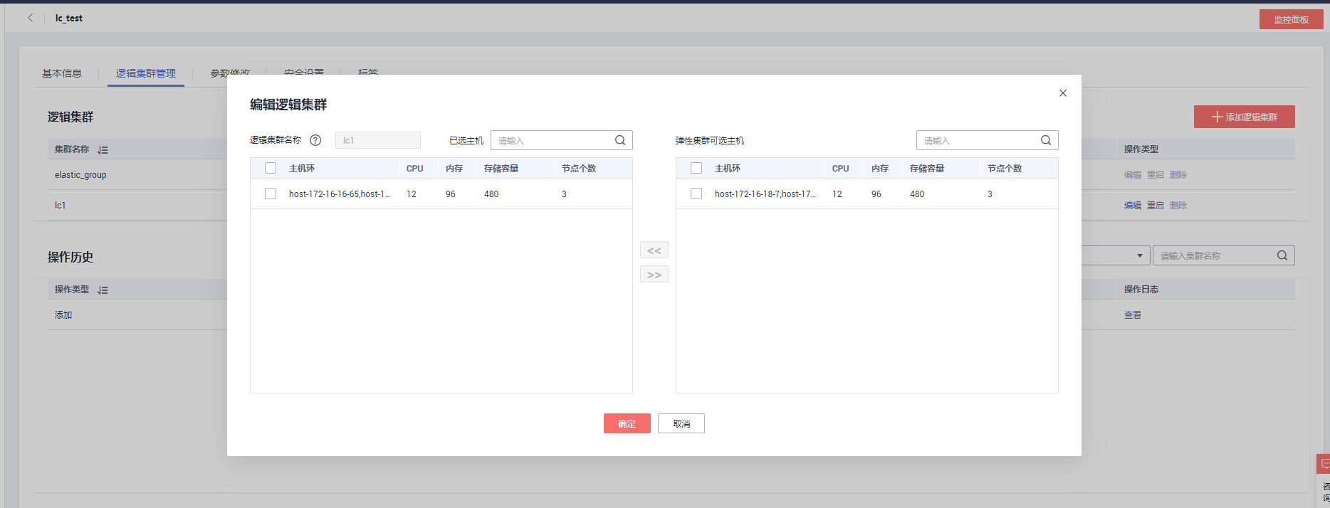 如果逻辑集群不在需要过多的资源,也可以将多余的节点缩容至弹性集群,同样,缩容逻辑集群也只能以主机环为单位;点击编辑按钮,将主机换环从逻辑集群中移至弹性集群,点击确定提交缩容任务。