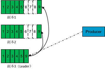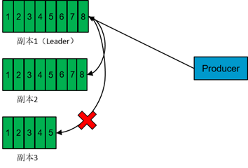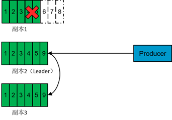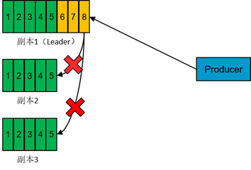 此时,如果副本1所在节点故障,副本2或副本3升为Leader,Leader切换后,消息记录以新Leader为准,未同步的第6,7,8条数据将会丢失,如下图所示:
