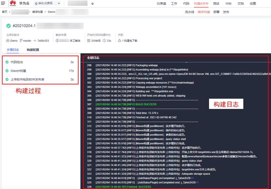 构建步骤配置完成后,可执行该任务,对指定的代码仓库进行编译构建。页面会显示构建过程和全量日志。
