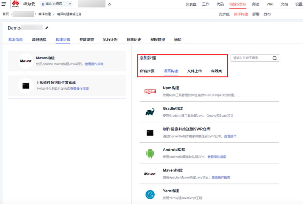 编译构建为开发者提供配置简单的混合语言构建平台,支持任务一键创建、配置和执行,实现获取代码、构建、打包等活动自动化。为客户提供高速、低成本、配置简单的混合语言构建能力,帮助用户缩短构建时间,提升构建效率。用户可根据自己的编程语言,编程环境,在“添加步骤”下根据提示自主配置所需的构建步骤。