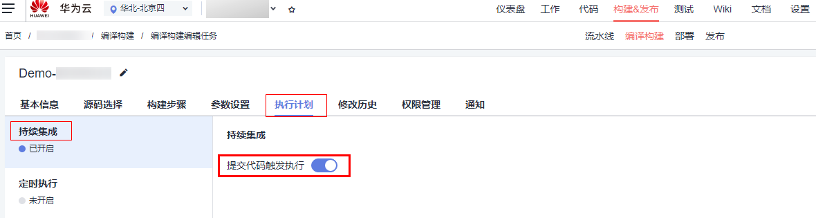 华为云DevCloud的编译构建功能支持持续集成,在【编译菜单】子菜单下点击“执行计划”,将“持续集成”选项中的“提交代码触发执行”开关打开即可。