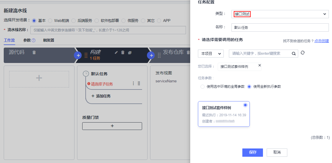 - 选择已有流水线或者单击“新建流水线”新建一个流水线,为流水线添加如下任务。编辑任务时,选择接口测试类型,并选择对应接口测试套件,加入流水线中自动化执行,即可实现持续自动化测试。