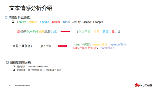 当前的文本情感分析就是根据输入文本,然后识别其中这五要素里的几个要素,现在还没有相关工作可以同时识别出五个要素。一般的话现在最简单的情感分析是只识别出这个文本的观点/情感,既不包含实体也不包含aspect并且也不包含观点持有者,再进一步的工作就是识别出针对哪一个aspect(实体)的观点(情感)。
