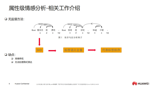 这种方法只能处理显示的表达,如果是隐式的表达,因为句子中没有属性词,那么通过句法解析没法得到对应的角色,所以无法分析来处理隐式的表达。这种无监督方法的优点是不需要标数据,缺点是准确率相对低一些,没法处理隐式表达。