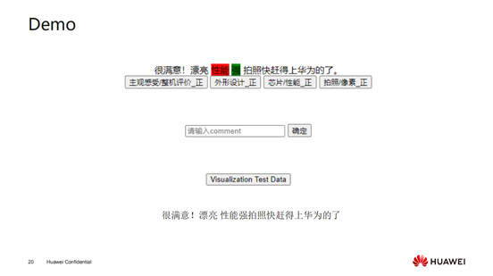 上图是我们一个简单的demo,输入一个样本,生成对应每个属性的正负面,当点击某个属性的时候它对应的评价词位置就可以高亮出来,红色代表属性描述词,绿色代表观点描述词。上面说的人工评价就是这些结果预测出来后,人工看看预测是否合理。