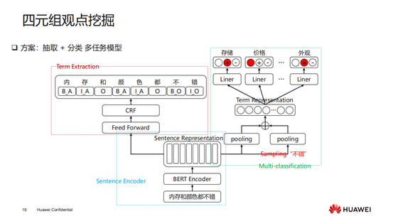 观点四元组挖掘这个任务不仅要分析出各个属性的正负面,还要定位出它属性描述词的位置以及观点描述词的位置。比如“手机内存非常大”中属性描述词定位到“内存”,评价词定位“非常大”,对于“性价比非常高”这句话,属性描述词定位到“性价比”,观点描述定位到“非常高”,不仅要识别出属性的类别还要定位到位置,所以这里一共有四个要素要预测出来,分别是属性词、属性类别、评价词和评价极性,其中属性类别和评价极性在前面的工作已经做到了。