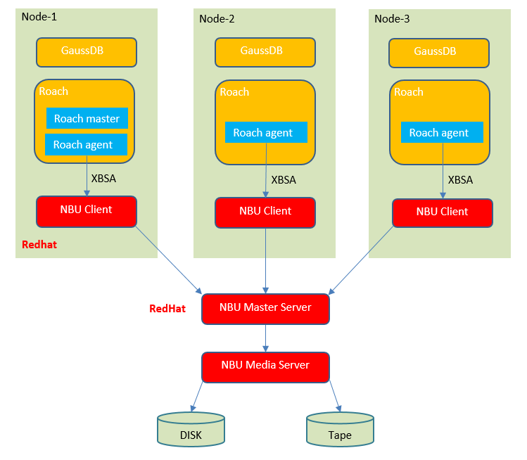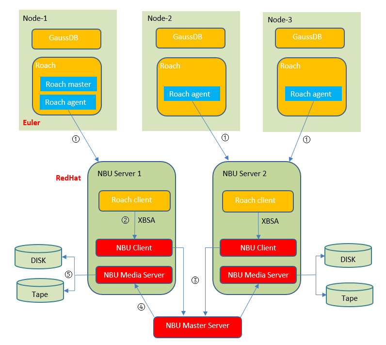 如上图,GaussDB的备份工具Roach,在每个节点都启动一至多个Roach agent进程,用于读取本节点的GaussDB数据,并将其存入缓存buffer。然后调用XBSA接口,将缓存数据转发给NBU处理。