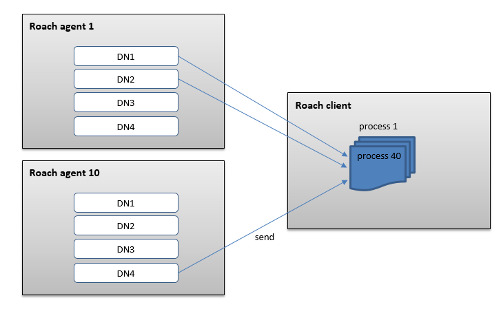 展开一点来说,集群内每个节点都有Roach agent进程负责本节点一至多个DN实例的数据备份,该进程会根据DN个数fork出多个子进程,每个Roach agent子进程负责一个DN。备份出来的数据会转发给远端备份服务器的Roach client进程,该进程内部又会根据DN个数fork出多个子进程,每个子进程负责与一个DN(亦对应一个Roach agent)通信。这里不能创建为线程是因为XBSA本身限制,每个进程才能独占一份NBU链接。即有如下映射关系图: