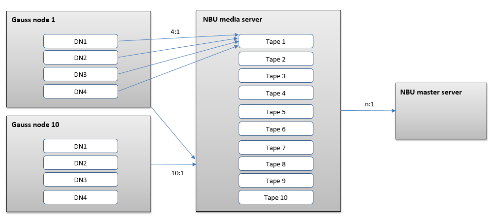 从性能角度考虑,需要根据一定比例配备多个NBU media server服务器。比如GaussDB集群有200个节点,每4个DN对应一个备份盘或磁带,每10个GaussDB节点配备一台NBU media server,则共需20台media服务器。示意图如下: